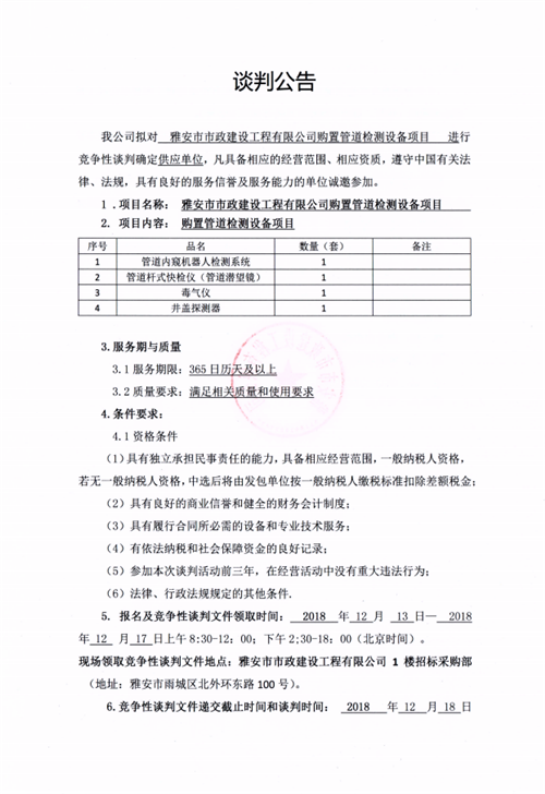 市政公司購(gòu)置管道檢測(cè)設(shè)備項(xiàng)目的競(jìng)爭(zhēng)性談判公告