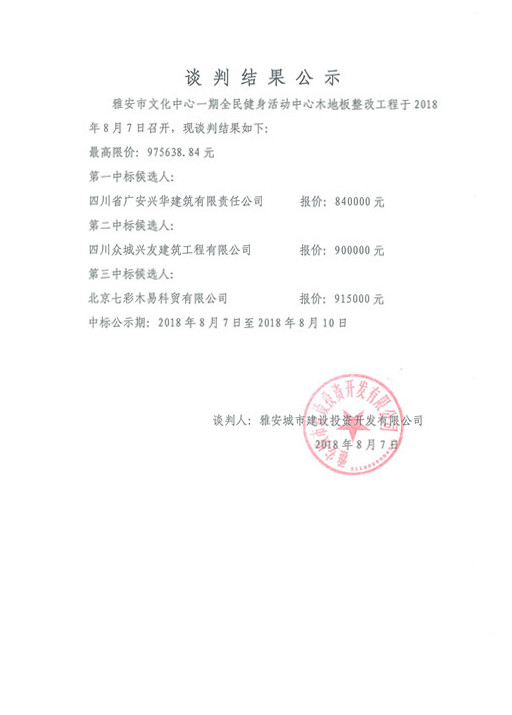 雅安市文化中心一期全民健身活動中心木地板整改工程競爭性談判結果公示