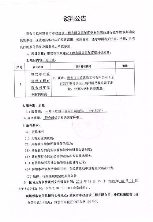 雅安市市政建設(shè)工程有限公司年度鋼材供應(yīng)商競(jìng)爭性談判公告