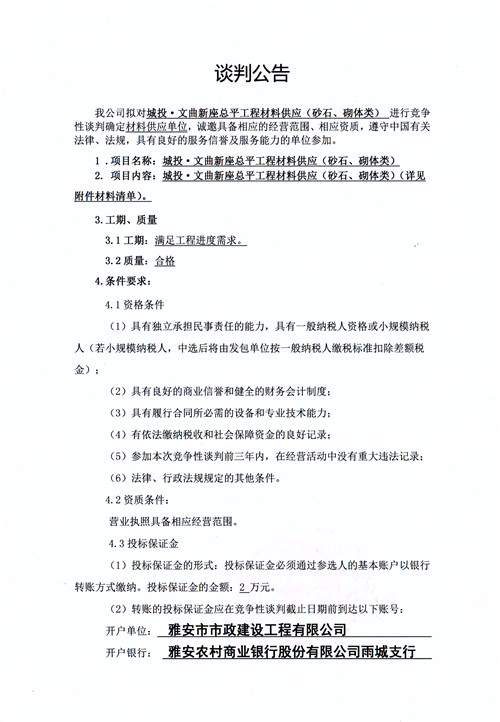 市政公司城投·文曲新座總平工程材料供應(yīng)(砂石、砌體類)競(jìng)爭(zhēng)性談判公告