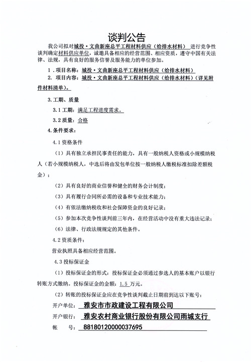 市政公司城投·文曲新座總平工程材料供應(yīng)(給排水材料)競(jìng)爭(zhēng)性談判公告