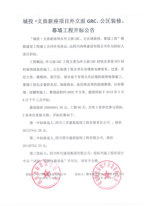 城投·文曲新座項(xiàng)目外立面GRC、公區(qū)裝修、幕墻工程開標(biāo)公告