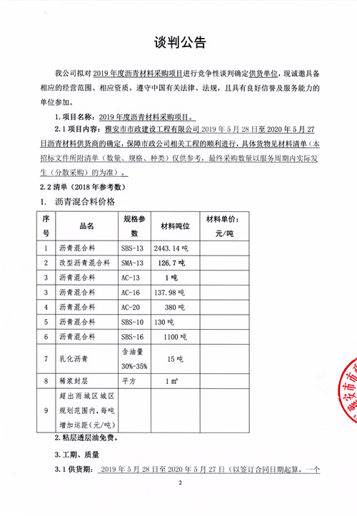 市政公司2019年度瀝青材料采購項目競爭性談判公告