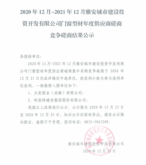 2020年12月-2021年12月雅安城市建設(shè)投資開發(fā)有限公司門窗型材年度供應(yīng)商磋商競(jìng)爭(zhēng)磋商結(jié)果公示