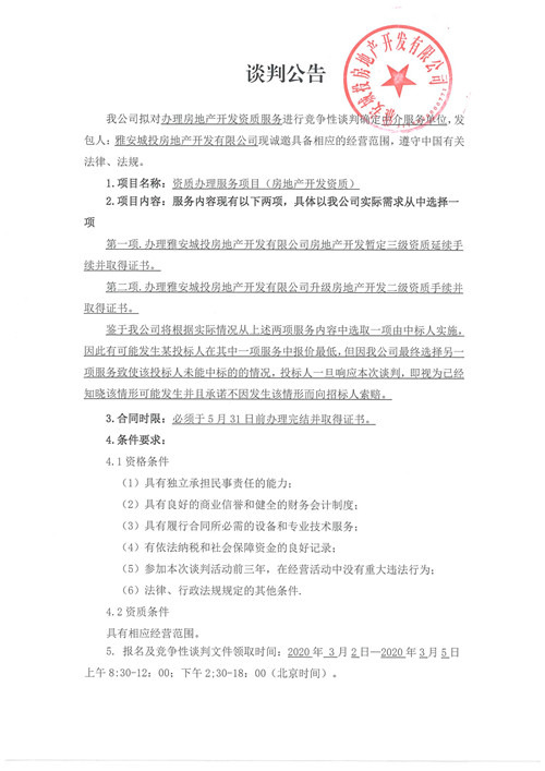 城投地產(chǎn)公司辦理房地產(chǎn)開(kāi)發(fā)資質(zhì)服務(wù)確認(rèn)中介服務(wù)單位的競(jìng)爭(zhēng)性談判公告