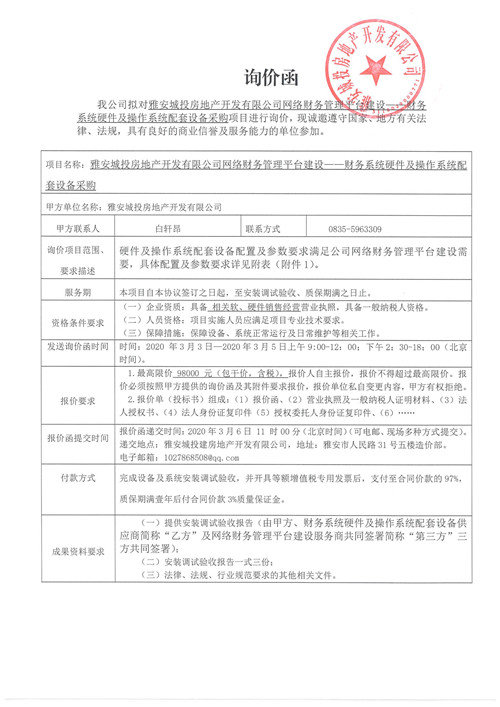 城投地產(chǎn)公司網(wǎng)絡財務管理平臺建設——財務系統(tǒng)硬件及操作系統(tǒng)配套設備采購項目詢價函