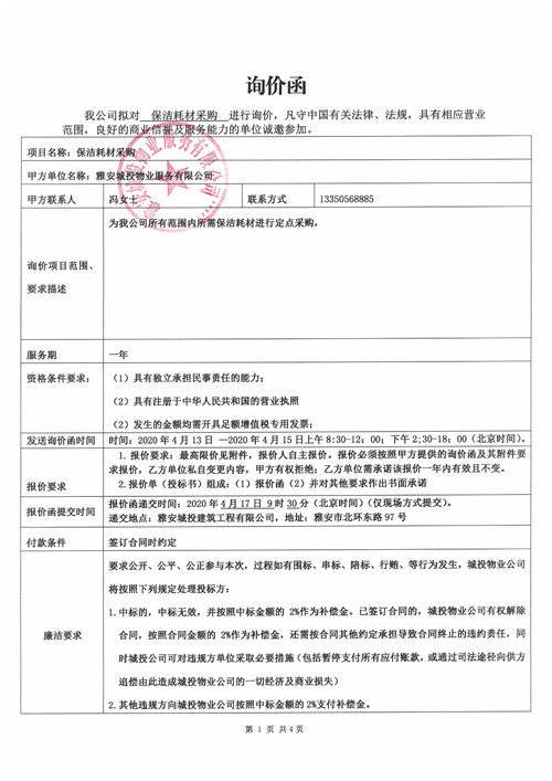 保潔耗材采購詢價(jià)函