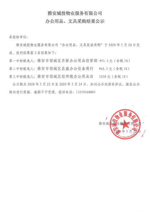 城投物業(yè)公司辦公用品、文具采購結果公示