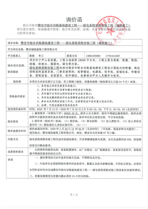 城投建工公司雅安市綜合訓(xùn)練基地建設(shè)工程——弱電系統(tǒng)采購(gòu)安裝工程詢價(jià)函