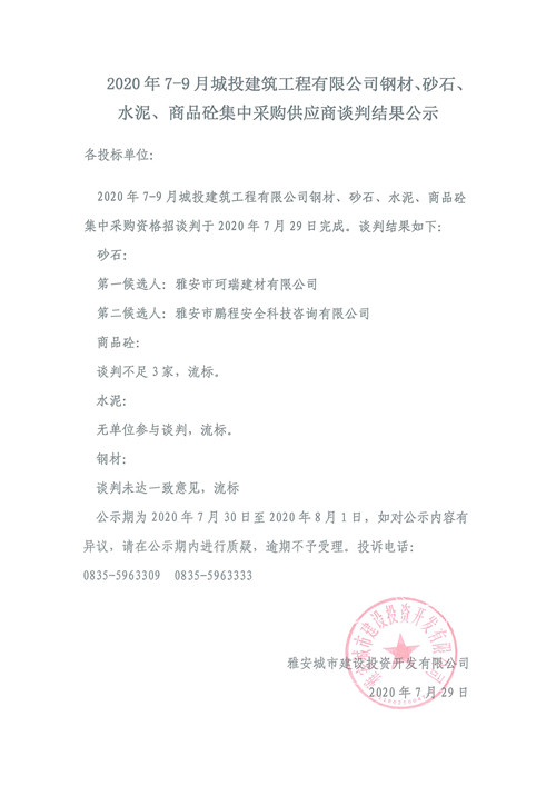 2020年7月-9月城投建筑工程有限公司鋼材、砂石、水泥、商品砼集中采購供應(yīng)商談判結(jié)果公示