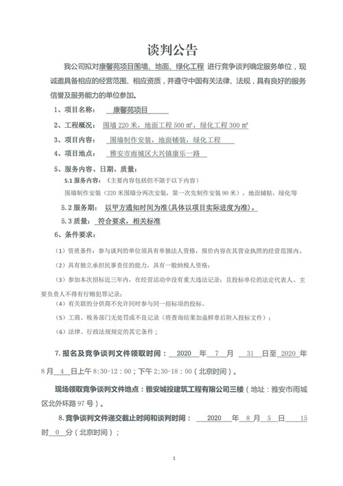 城投建工公司康馨苑項目圍墻、地面、綠化工程競爭性談判公告
