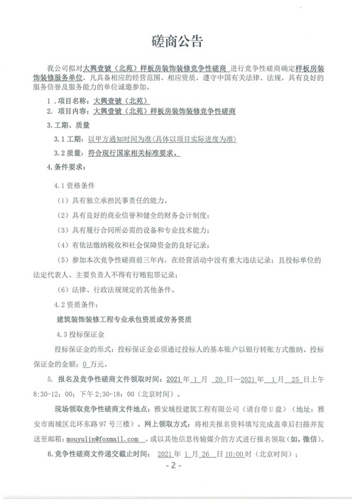 雅安城投建筑工程有限公司大興壹號(hào)(北苑)樣板房裝飾裝修競爭性磋商公告