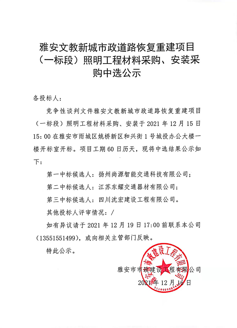 雅安文教新城市政道路恢復重建項目(一標段)照明工程材料采購、安裝采購中選公示