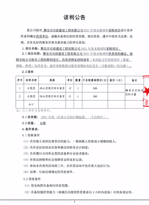 雅安市市政建設(shè)工程有限公司2021年度水穩(wěn)材料采購項目