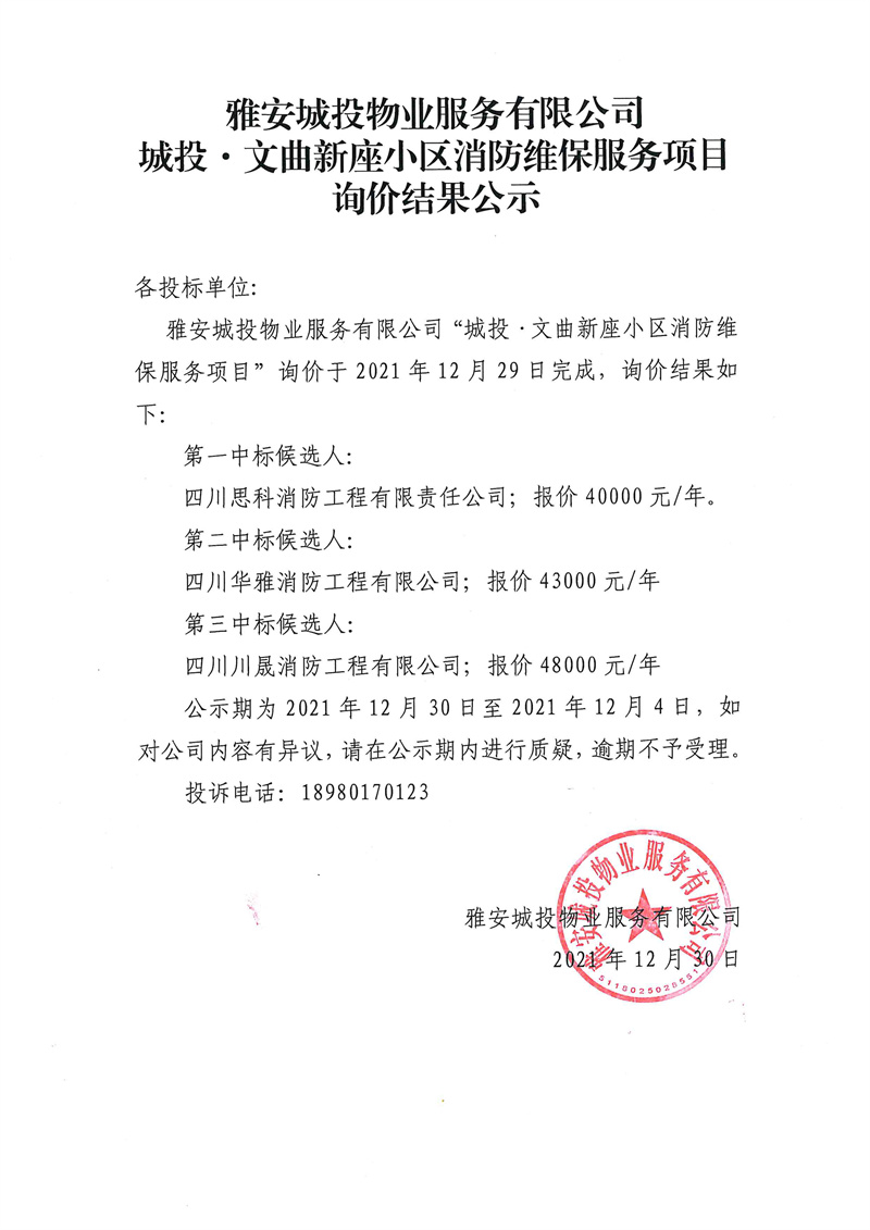 城投·文曲新座小區(qū)消防維保服務項目詢價結果公示