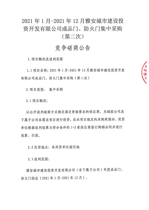 2021年1月-2021年12月雅安城市建設(shè)投資開發(fā)有限公司成品門、防火門集中采購(第二次)競爭磋商公告