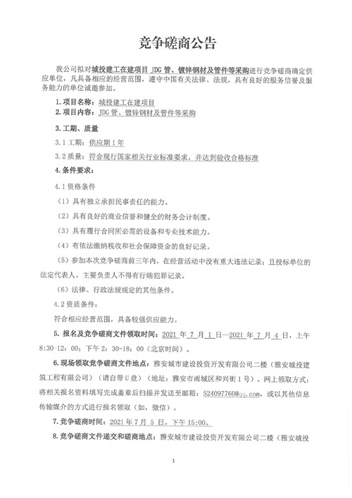 城投建工公司在建項(xiàng)目JDG管、鍍鋅鋼材及管件等采購(gòu)競(jìng)爭(zhēng)性磋商公告(第二次)
