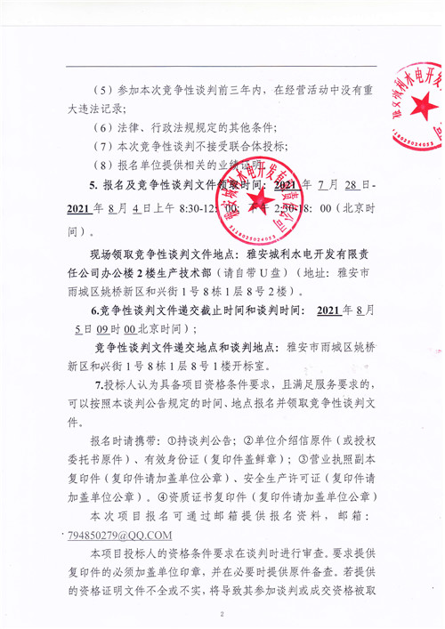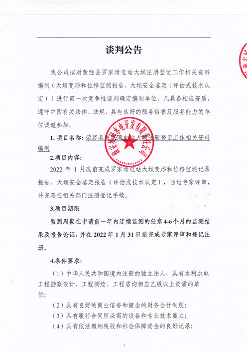 城利水電公司滎經(jīng)縣羅家灣電站大壩注冊(cè)登記工作相關(guān)資料編制競(jìng)爭性談判公告