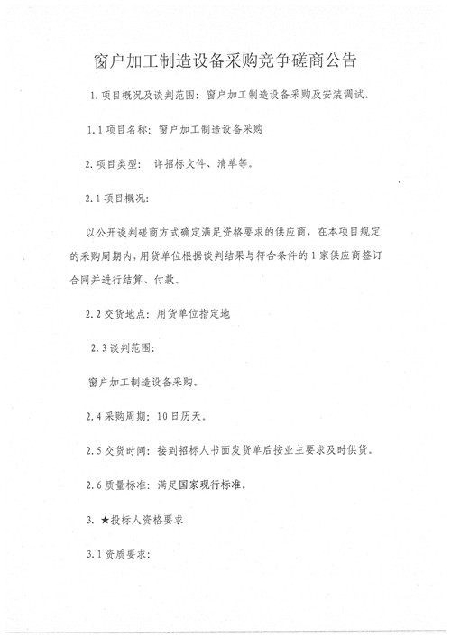 城投工匠公司窗戶加工制造設(shè)備采購(gòu)競(jìng)爭(zhēng)磋商公告