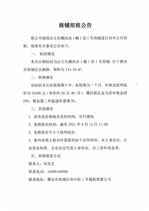城投智慧公司漢文化棚改房1幢1層1號(hào)商鋪招租公告