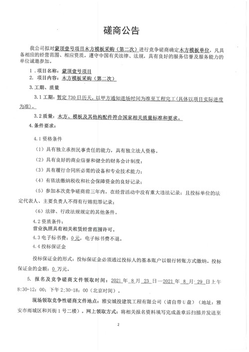 城投建工公司蒙頂壹號項目木方模板采購競爭磋商公告(第二次)