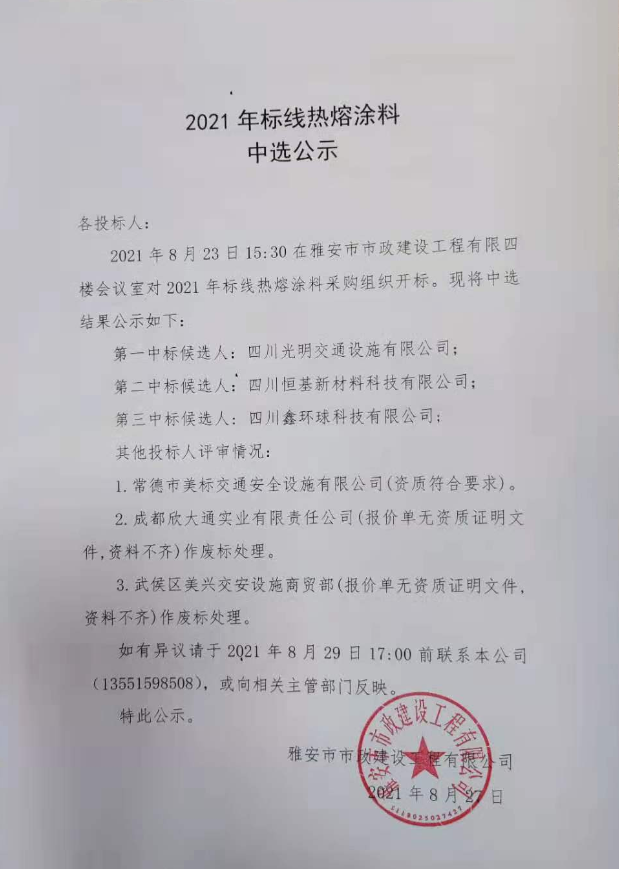 市政公司2021年標(biāo)線熱熔涂料詢價(jià)結(jié)果公示