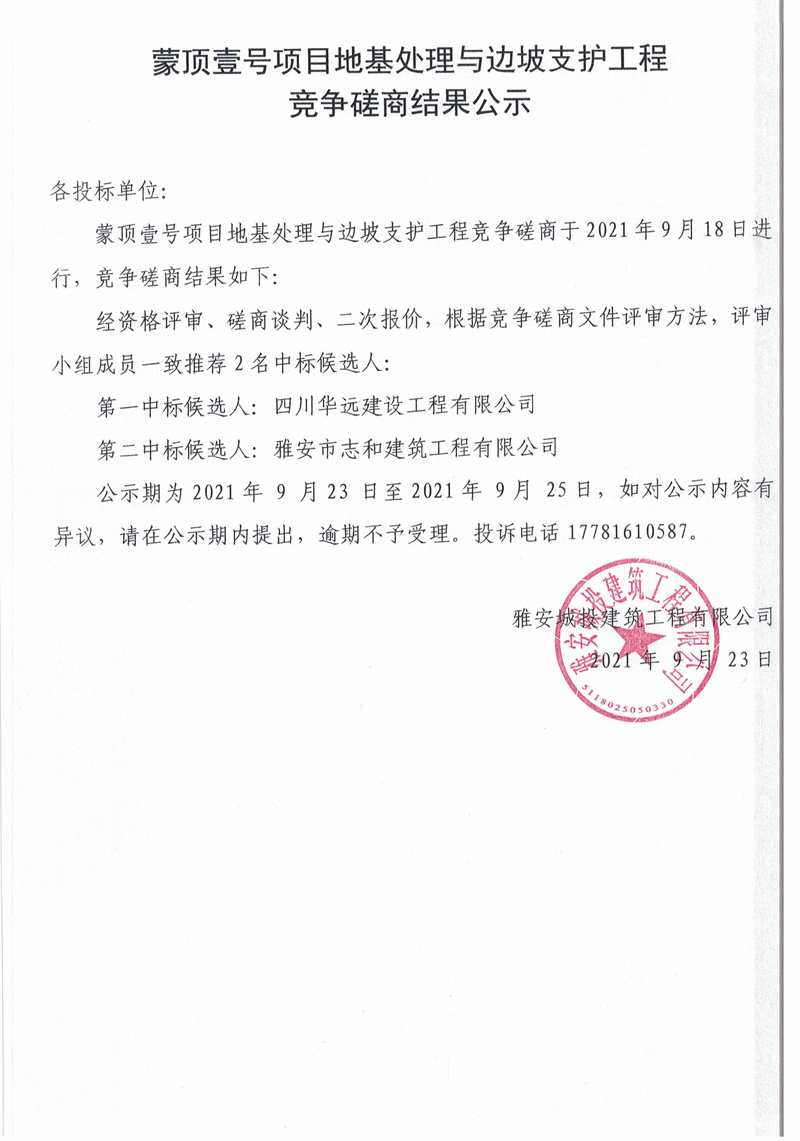 蒙頂壹號基礎抗浮錨桿及基坑支護工程競爭磋商結果公示