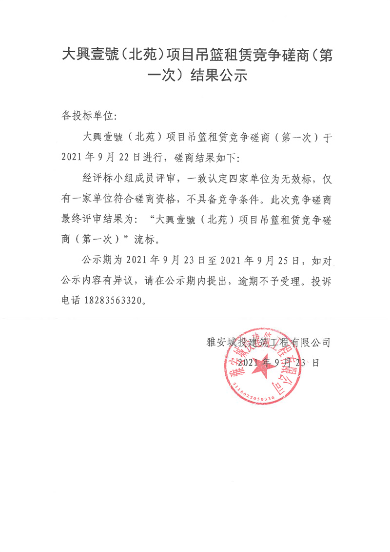 大興壹號(hào)(北苑)項(xiàng)目吊籃租賃競(jìng)爭性磋商(第一次)結(jié)果公示
