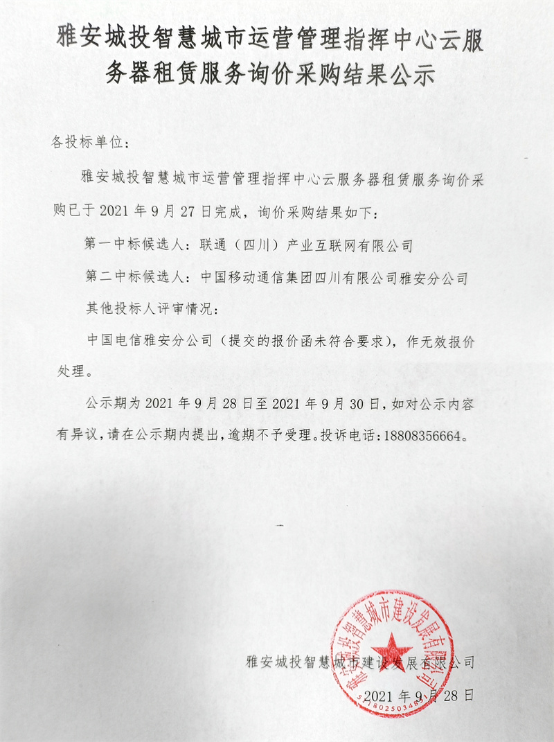 雅安城投智慧城市運(yùn)營(yíng)管理指揮中心云服務(wù)器租賃服務(wù)采購詢價(jià)結(jié)果公示