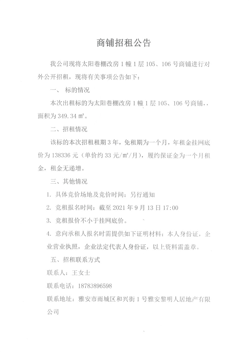 黎明人居公司太陽巷棚改房1幢1層105、106號商鋪招租公告