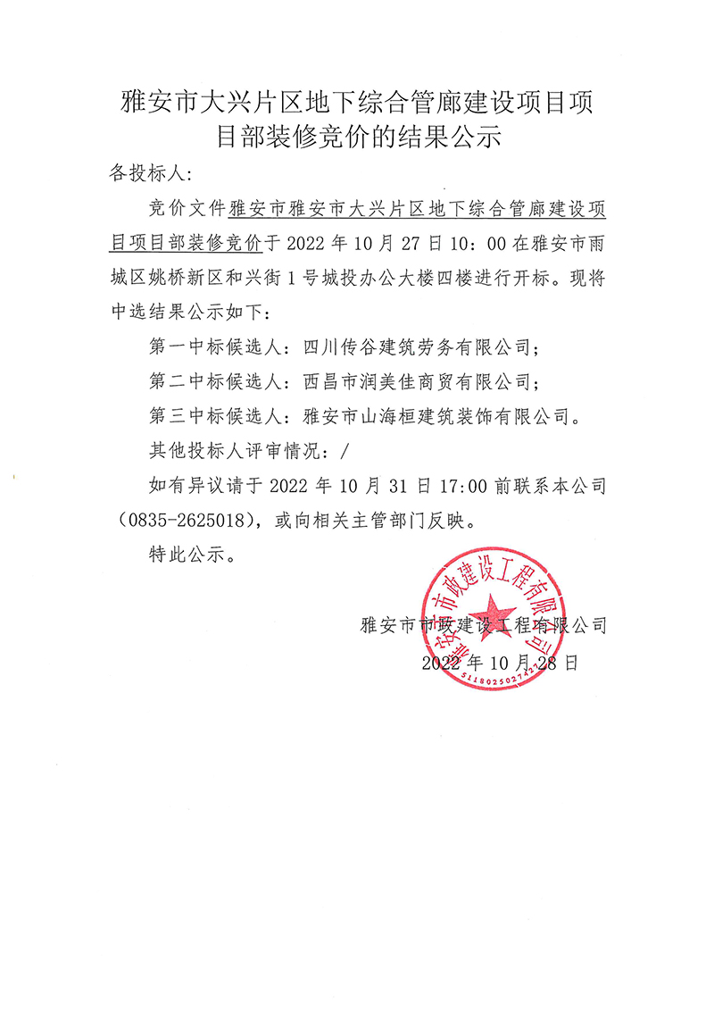 雅安市大興片區(qū)地下綜合管廊建設(shè)項(xiàng)目項(xiàng)目部裝修競價(jià)的結(jié)果公示