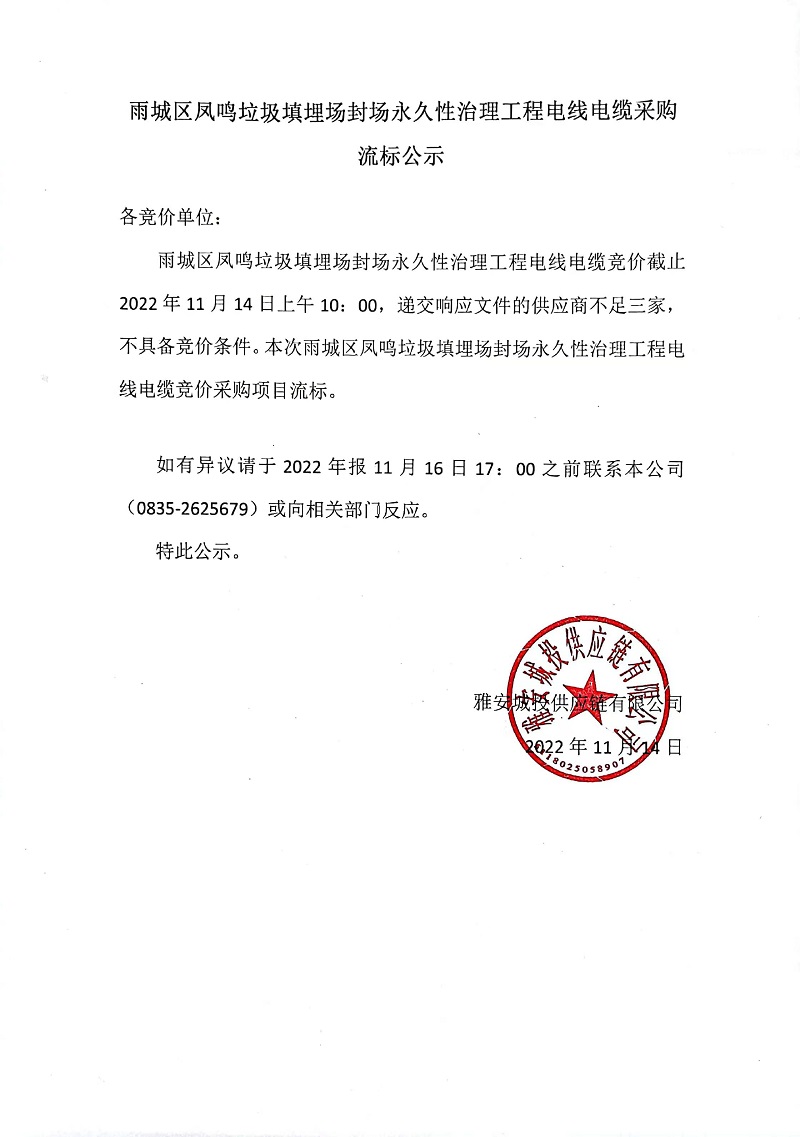 雨城區(qū)鳳鳴垃圾填埋場封場永久性治理工程電線電纜采購流標(biāo)公示