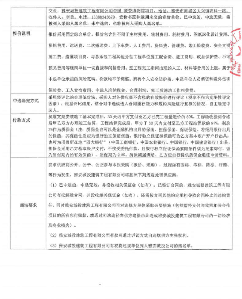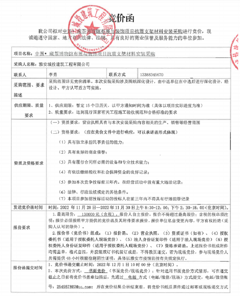中國藏茶博物館布展與裝飾項(xiàng)目抗震支架材料安裝競價(jià)公告