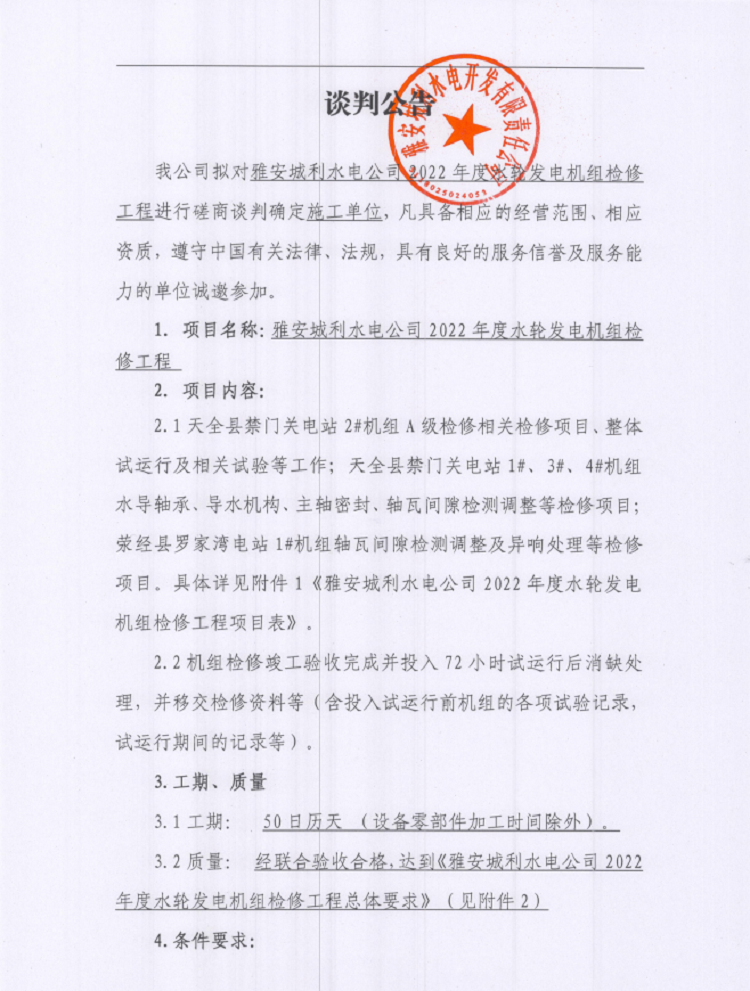 雅安城利水電公司2022年度水輪發(fā)電機組檢修工程談判磋商公告