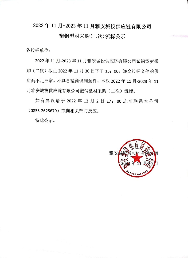 2022年11月-2023年11月雅安城投供應鏈有限公司塑鋼型材采購(二次)流標公示