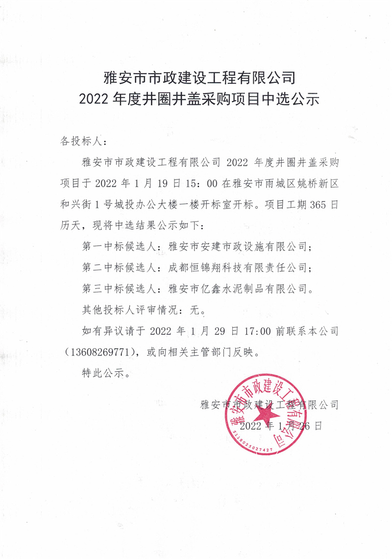 雅安市市政建設(shè)工程有限公司2022年度井圈井蓋采購項目中選公示