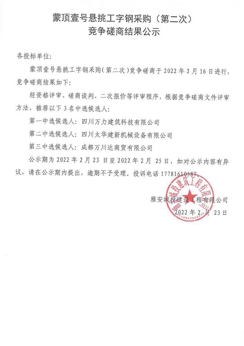 蒙頂壹號懸挑工字鋼采購(第二次)競爭磋商結果公示