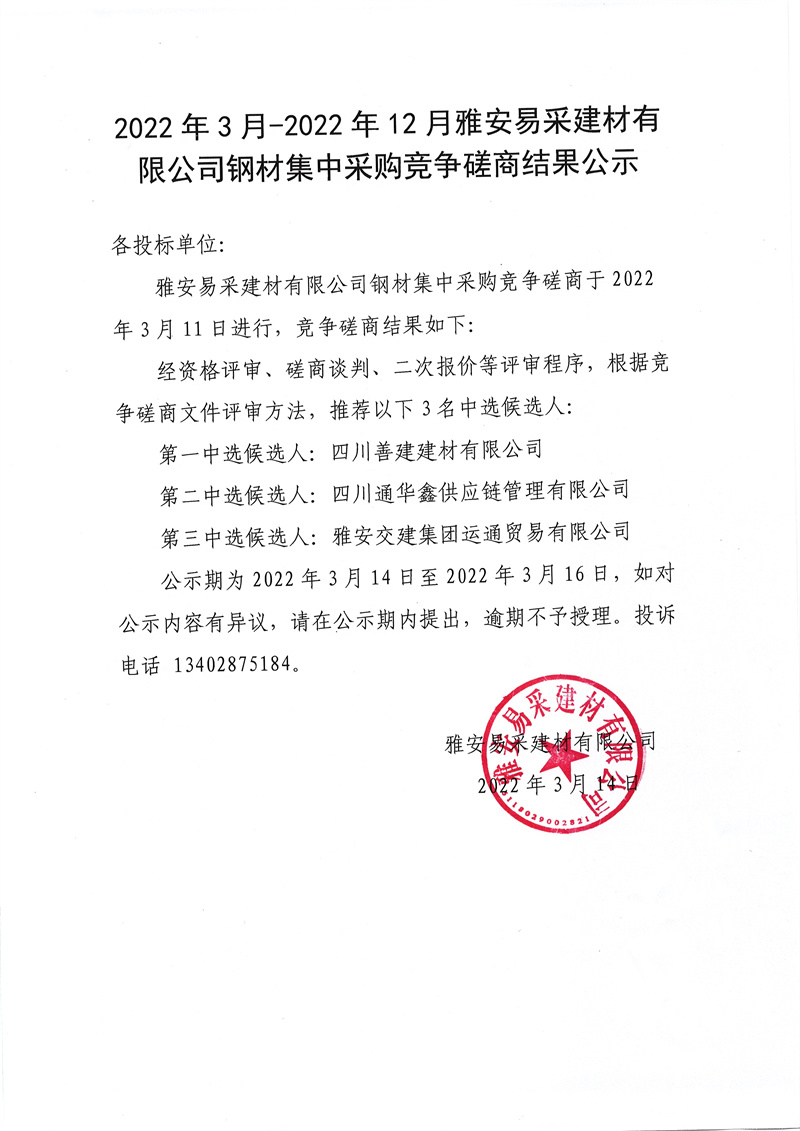 2022年3月-2022年12月雅安易采建材有限公司鋼材采購競(jìng)爭(zhēng)磋商結(jié)果公示