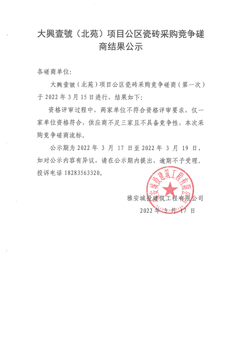 城投建工公司大興壹號(北苑)項目公區(qū)瓷磚采購競爭磋商結(jié)果公示