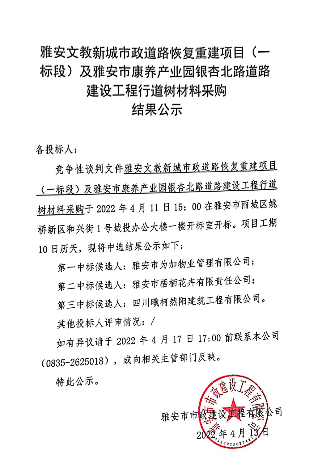 雅安文教新城市政道路恢復(fù)重建項(xiàng)目(一標(biāo)段)及雅安市康養(yǎng)產(chǎn)業(yè)園銀杏北路道路建設(shè)工程行道樹(shù)材料采購(gòu)結(jié)果公示