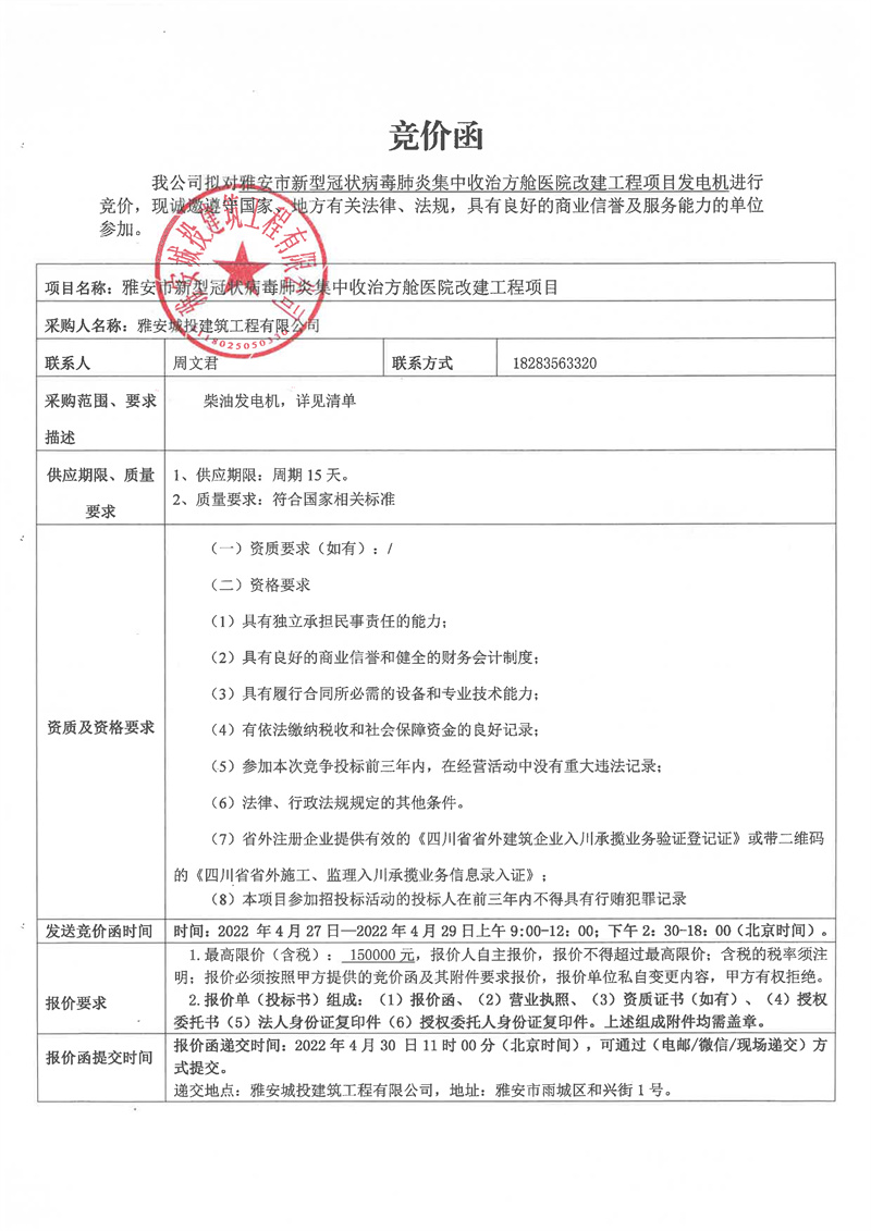 雅安市新型冠狀病毒肺炎集中收治方艙醫(yī)院改建工程項目發(fā)電機競價函