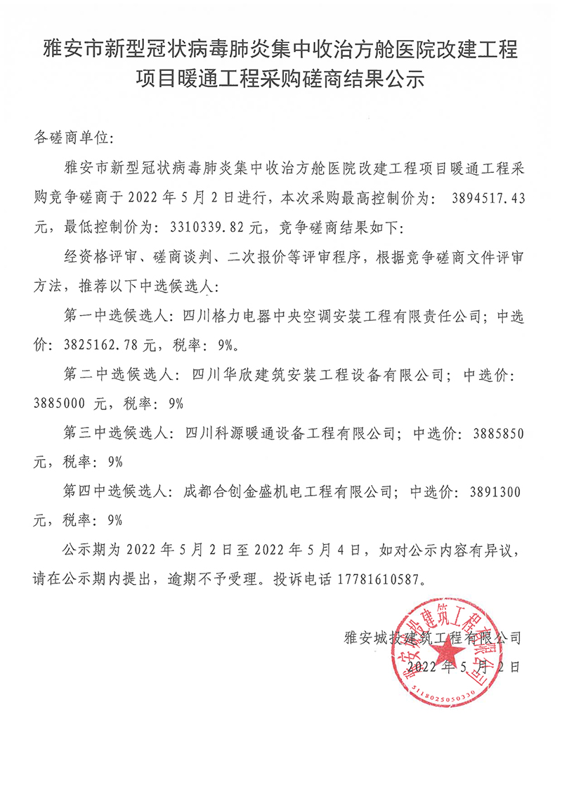 雅安市新型冠狀病毒肺炎集中收治方艙醫(yī)院改建工程項(xiàng)目暖通工程采購(gòu)磋商結(jié)果公示