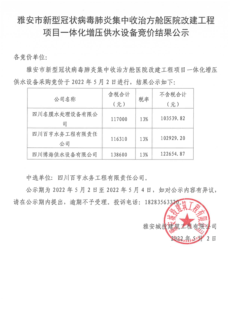 雅安市新型冠狀病毒肺炎集中收治方艙醫(yī)院改建工程項目一體化增壓供水設備競價結果公示