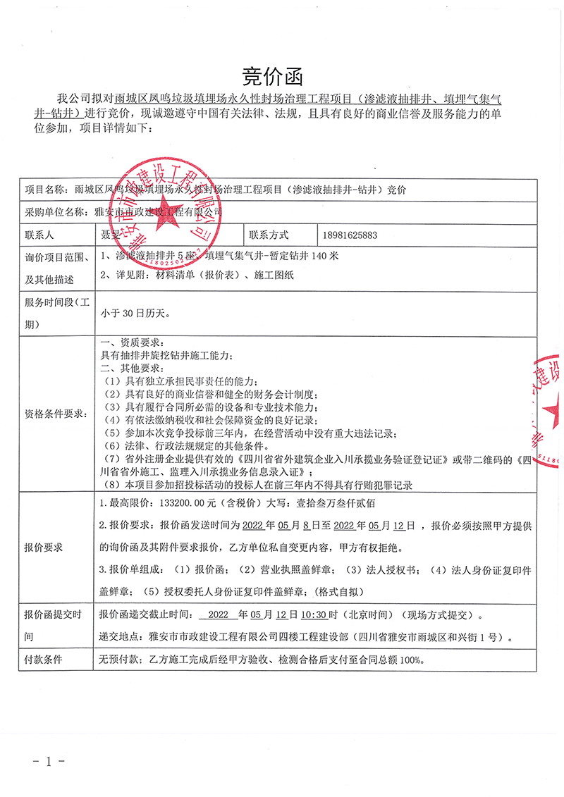 雨城區(qū)鳳鳴垃圾填埋場(chǎng)永久性封場(chǎng)治理工程項(xiàng)目(滲濾液抽排井、填埋氣集氣井鉆井)競(jìng)價(jià)公告
