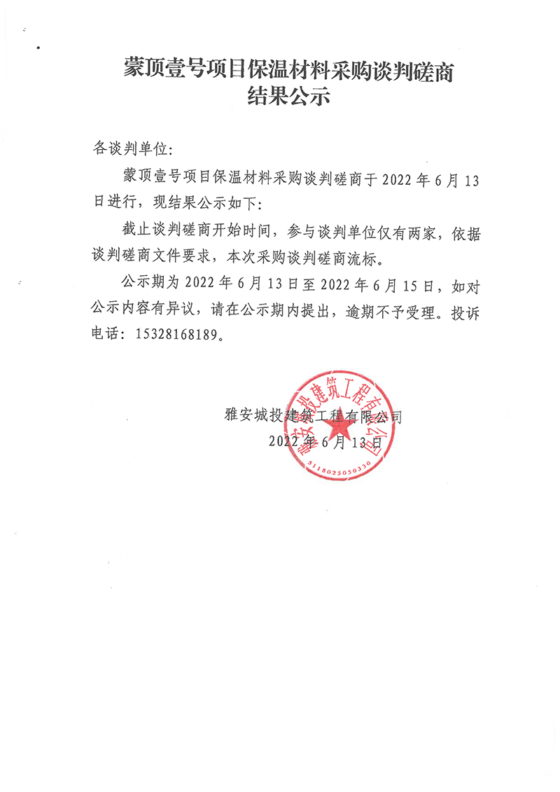 蒙頂壹號項目保溫材料采購談判磋商結果公示