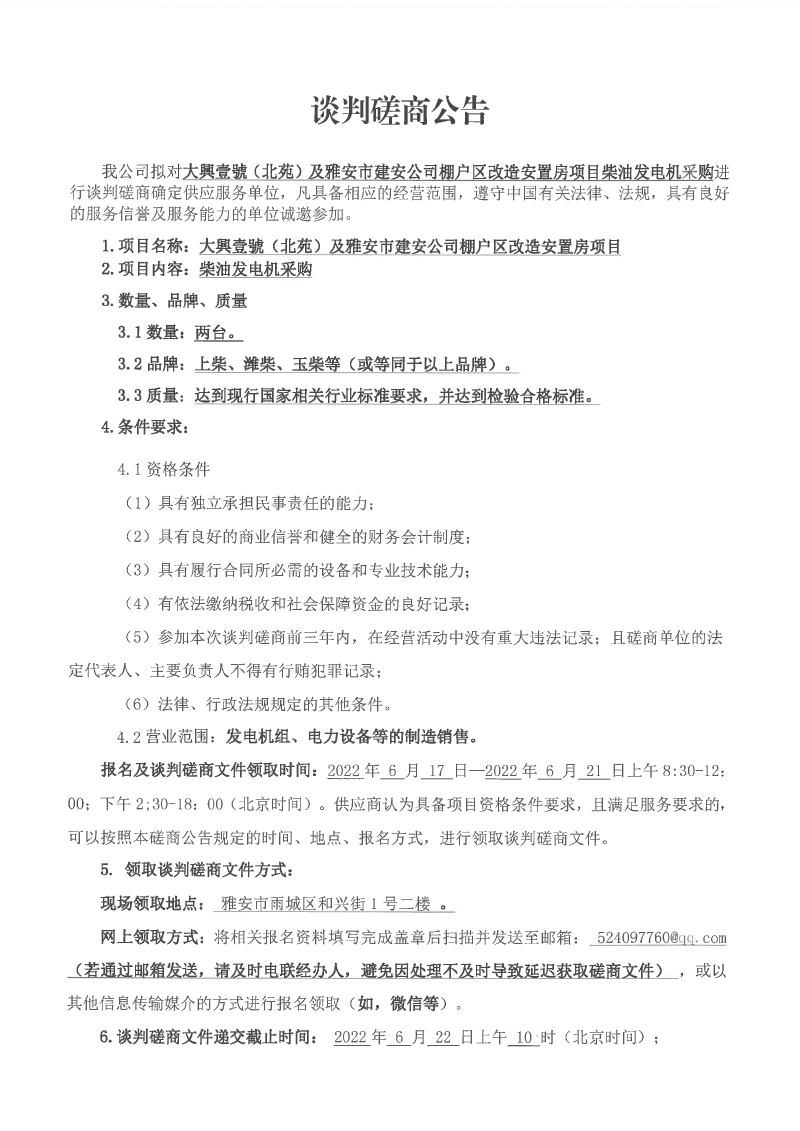 大興壹號(北苑)及雅安市建安公司棚戶區(qū)改造安置房項目柴油發(fā)電機采購談判磋商公告