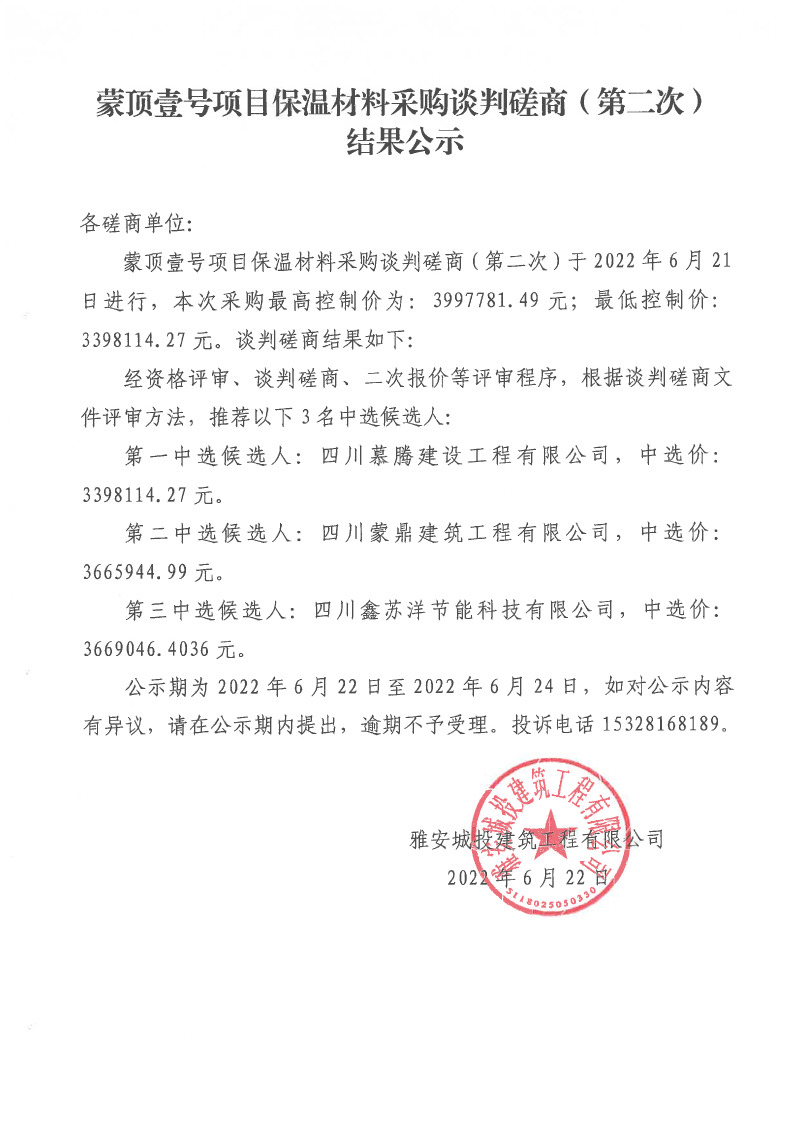 蒙頂壹號(hào)項(xiàng)目保溫材料采購談判磋商(第二次)結(jié)果公示