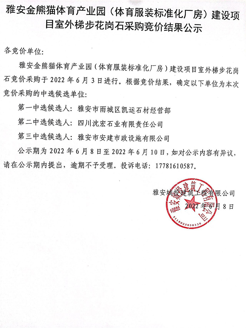 雅安市金熊貓體育產業(yè)園標準化廠房項目室外梯步花崗石采購競價結果公示