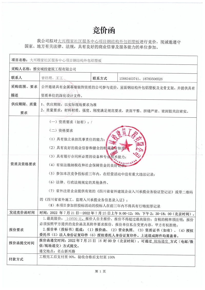 大興穆家社區(qū)服務(wù)中心項目鋼結(jié)構(gòu)外包鋁塑板競價公告
