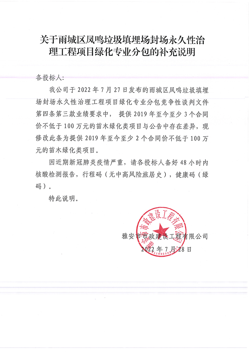 關(guān)于雨城區(qū)鳳鳴垃圾填埋場封場永久性治理工程項(xiàng)目綠化專業(yè)分包的補(bǔ)充說明